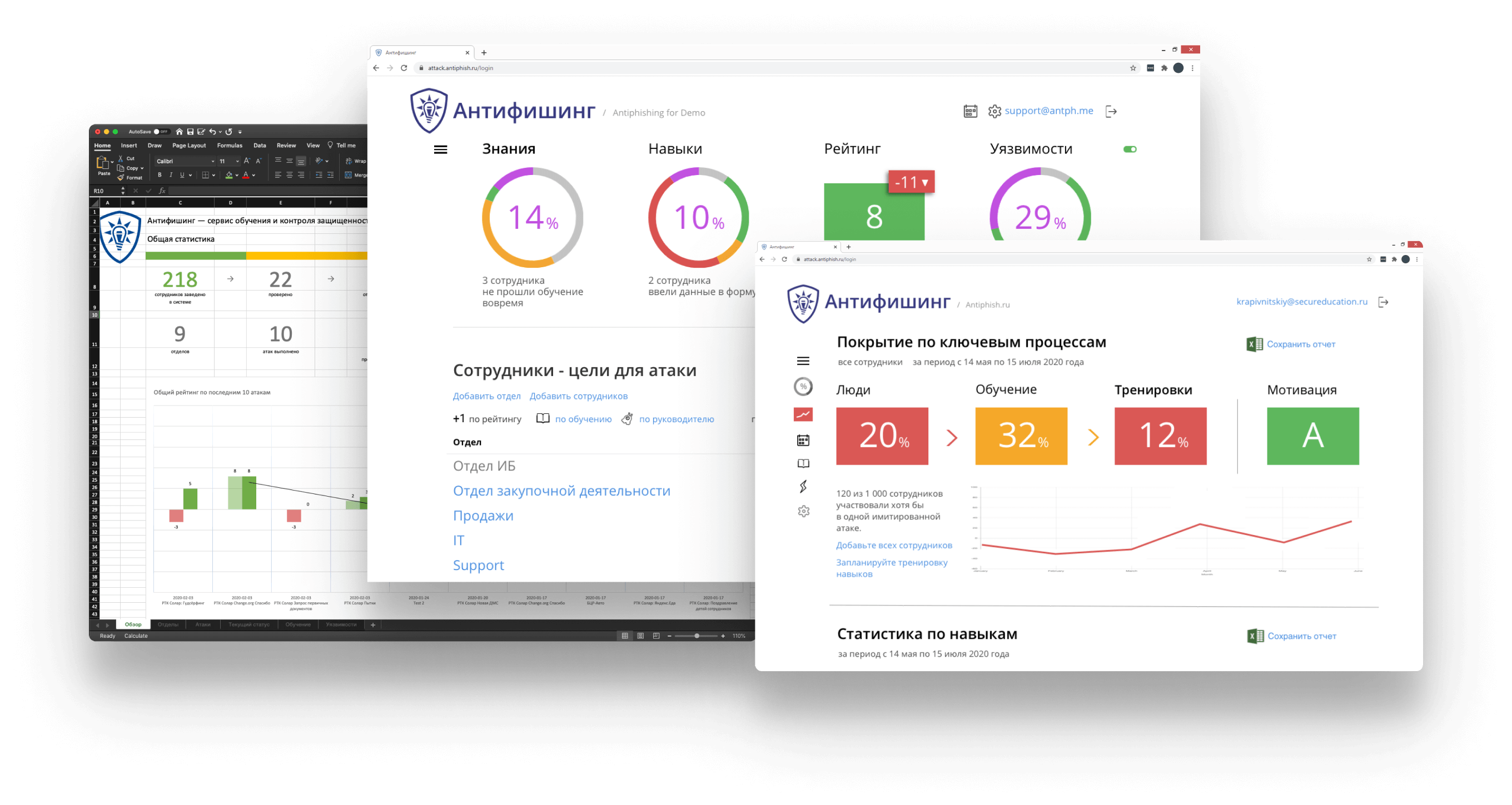 Ключевые показатели отчета по атакам: статистика по опасным действиям (переходы по ссылкам, скачивание вложений, ввод паролей), число сотрудников проваливших атаку, процент от общего числа